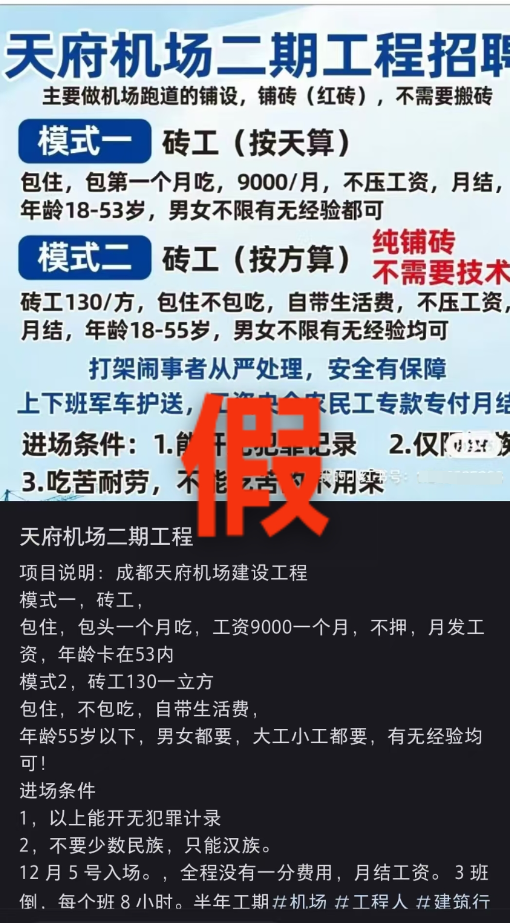 天府国际机场二期工程目前正开展前期工作,尚未启动任何工程施工招采等工作,网上所谓“砖墙施工”“项目招商”“劳务分包”等内容均为虚假信息。任何以天府国际机场二期工程名义虚构项目进行的宣传推广、合同签订、收取费用等行为,均涉嫌诈骗。