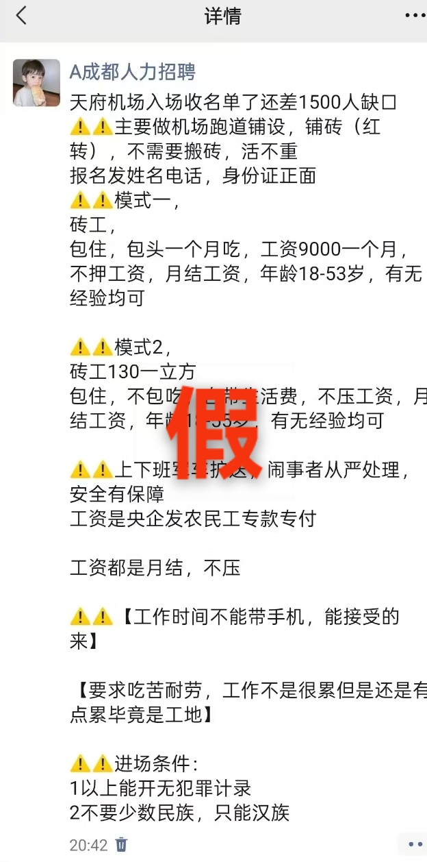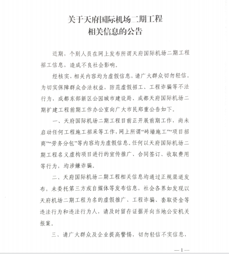 公告中提到,近期,个别人员在网上发布所谓天府国际机场二期工程招工信息,造成不良社会影响。经核实,相关内容均为虚假信息,请广大群众切勿轻信。